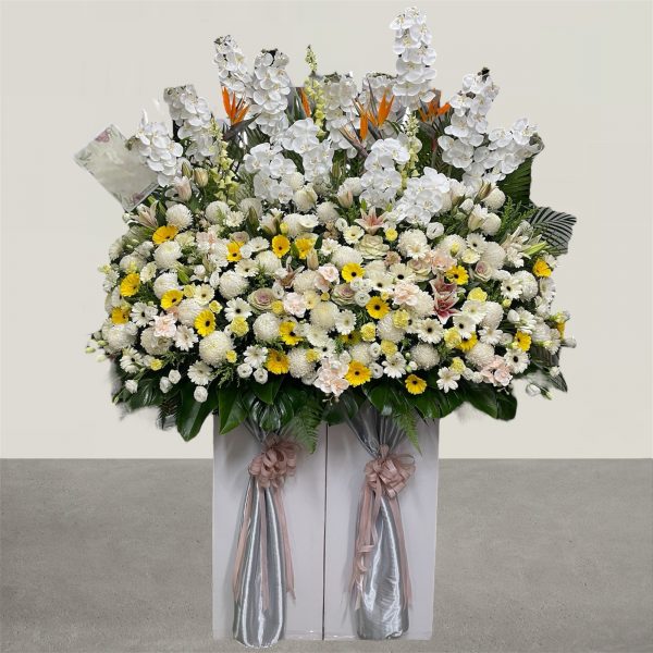 A grand condolence stand with a mix of fresh and faux flowers can create a beautiful, respectful display