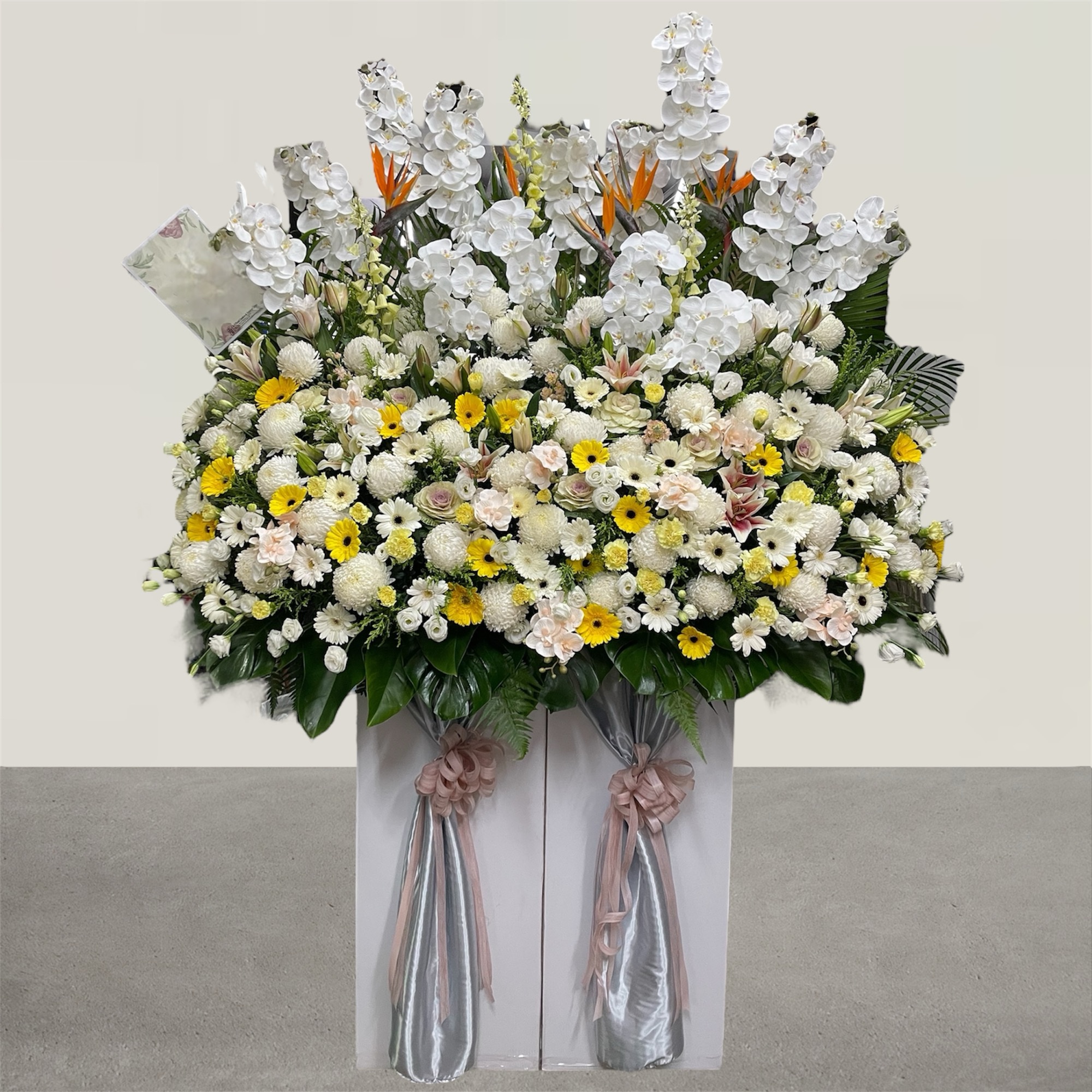 The stand could be layered with faux orchids and birds of paradise for height. lilies Roses, gerberas, carnations, eustoma, and chrysanthemums would fill in around the base and sides, creating a balanced and lush display.