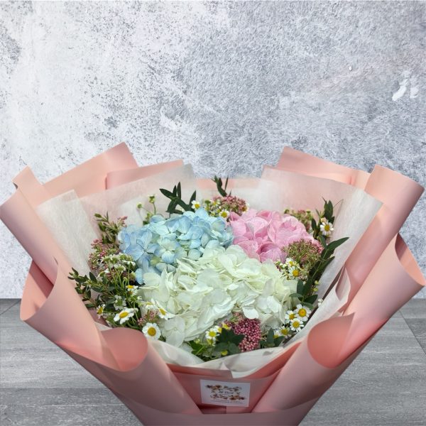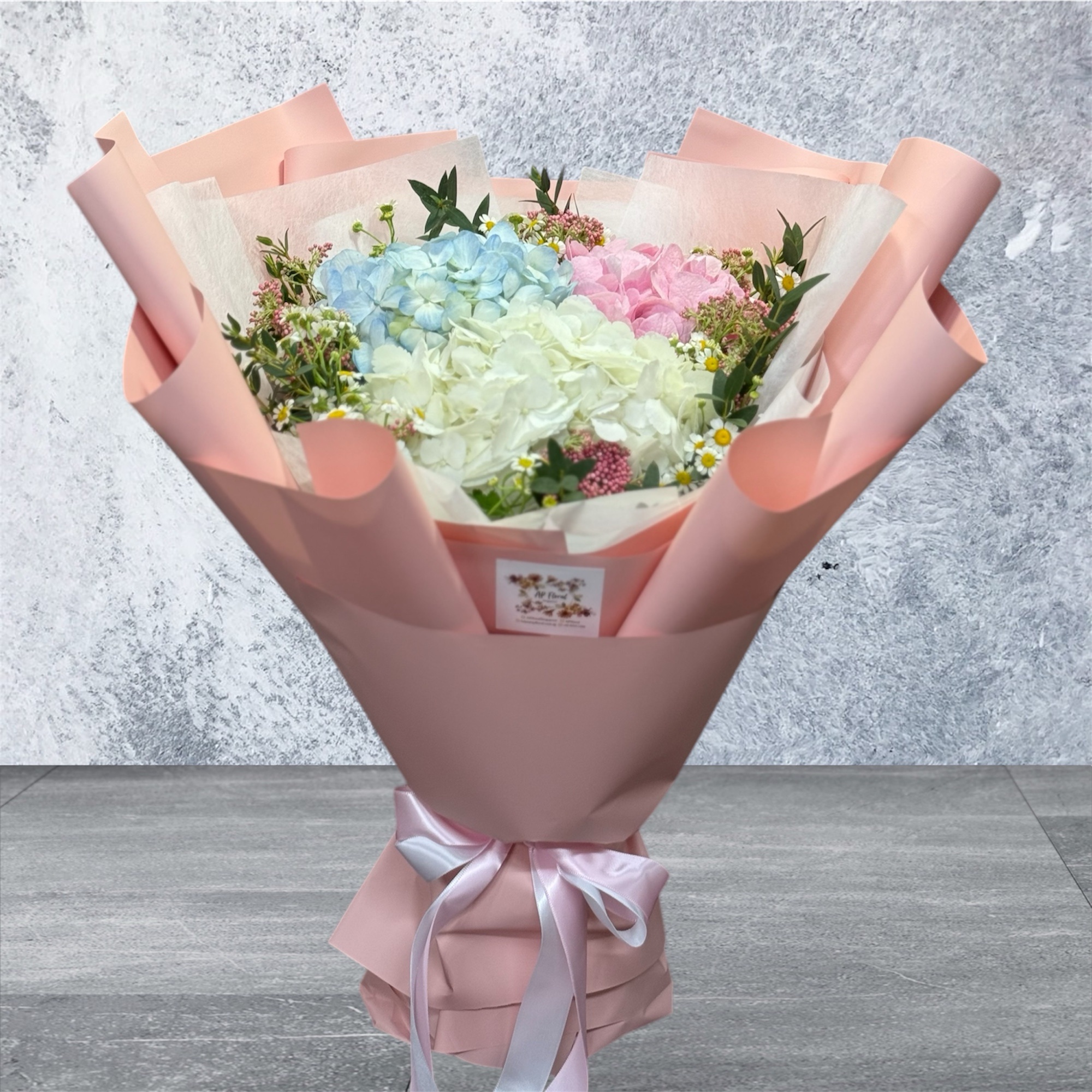 An exquisite bouquet showcasing lush hydrangeas, artfully paired with premium seasonal fillers. A sophisticated arrangement that exudes elegance and timeless charm.